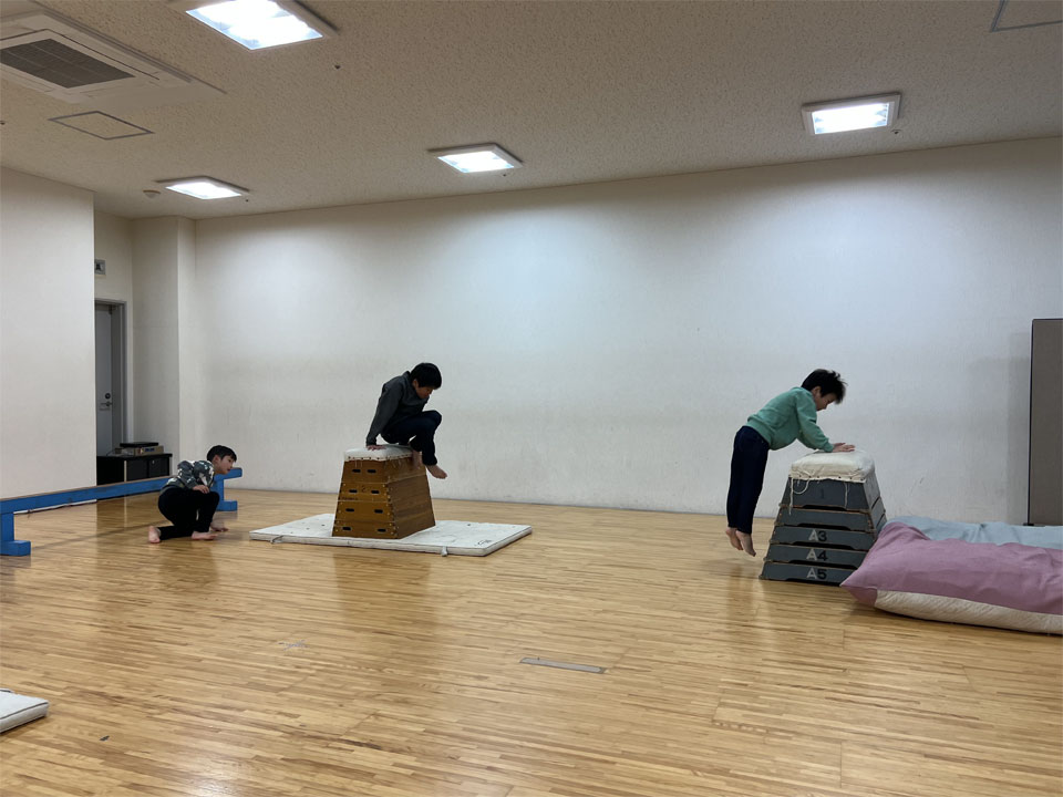 パルクールレッスンでは、「動作をつなげる」ことを意識しています。「跳ぶ」「くぐる」「回る」などといった異なる動作を連続で行うことで「滑らかな動き」を身につけていきます。