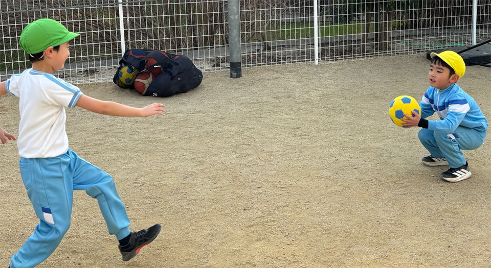 「だるまさんが転んだ」をしています。鬼がボールを持っている時はストップ、バウンドしている時は動きます。