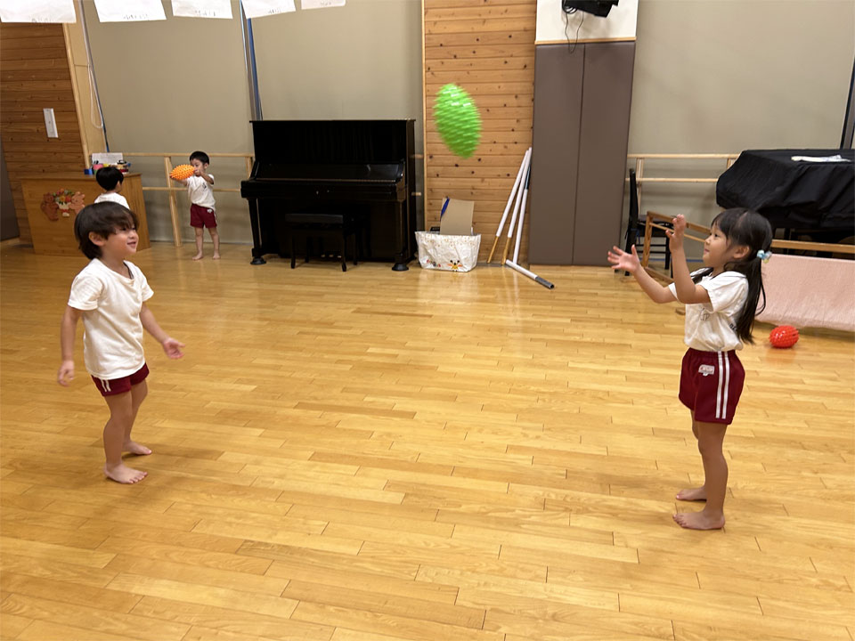 私のレッスンでは、秋には球技を行います。今回は柔らかいラグビーボールを使ってキャッチボール!