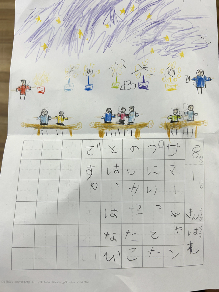マシュマロを火であぶってたべました。はなびもやりました。ロッジにとまりました。川あそびもやりましたが、水がつめたかったです。ふくの色ぞめもやりました。はじめてのことばっかりでたのしかったです。