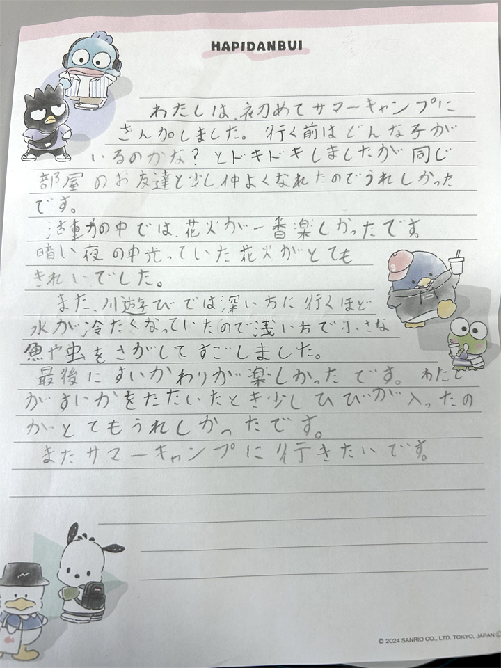 帰ってきてから、まだキャンプ気分だったのか、お父さんの事を「先生」とよんでしまいました。また来年も行って、友だちと遊びたいです。