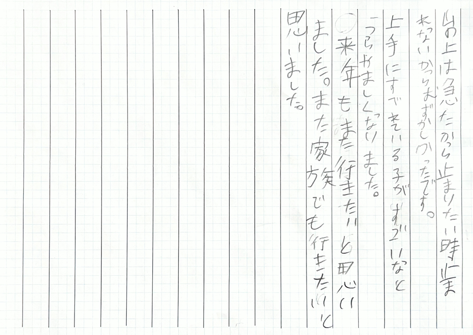 子ども達の姿として親元を離れて生活するたくましさはもちろん、ツアー中を全力で楽しむ姿が見られました。子ども達が「楽しかった!」と親御さんに話す姿が何より嬉しく感じます。